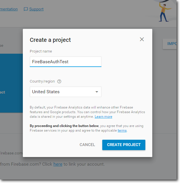 Before you start, you might check the Firebase prerequisites HERE. You do not have to expect anything surprising, even though Google Play services dependency might be an issue in rare cases (e.g. if China's audience is your goal as Google Play services are banned there). Now log into Firebase console with your Google account: https://console.firebase.google.com Firebase console gives you access to all of your Firebase projects, services and configuration options. All in one place. Click on "Add/Create project" and pick up the name you like.