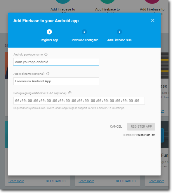 Enter package name, optional nick name and debug SHA-1 key. You are going to use Google Sign-in in this example, thus entering the debug key would be necessary.