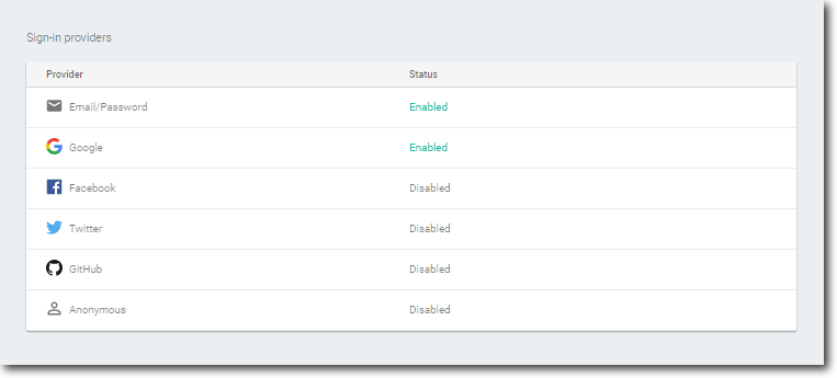 Get back to the console and click on "GET STARTED" on Authentication tile. On Authentication page click on "SET UP SIGN-IN METHOD". You can see the list of available providers. In this example we will enable Email/Password and Google sign-in methods.